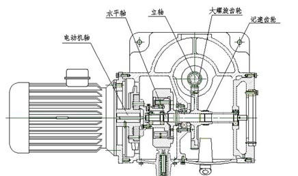橫軸是將電機的動力傳遞到立軸和轉鼓的主要部件。由電機、聯(lián)軸器、液力偶合器、傳動軸、大螺旋齒輪和剎車輪等零件組成。其結構緊湊,運轉平穩(wěn)。采用液力偶合器傳動,同時起到過載保護作用。大螺旋齒輪在運轉過程中連續(xù)不斷地將潤滑油飛濺到各傳動軸承,使所有軸承得到很好的潤滑作用。