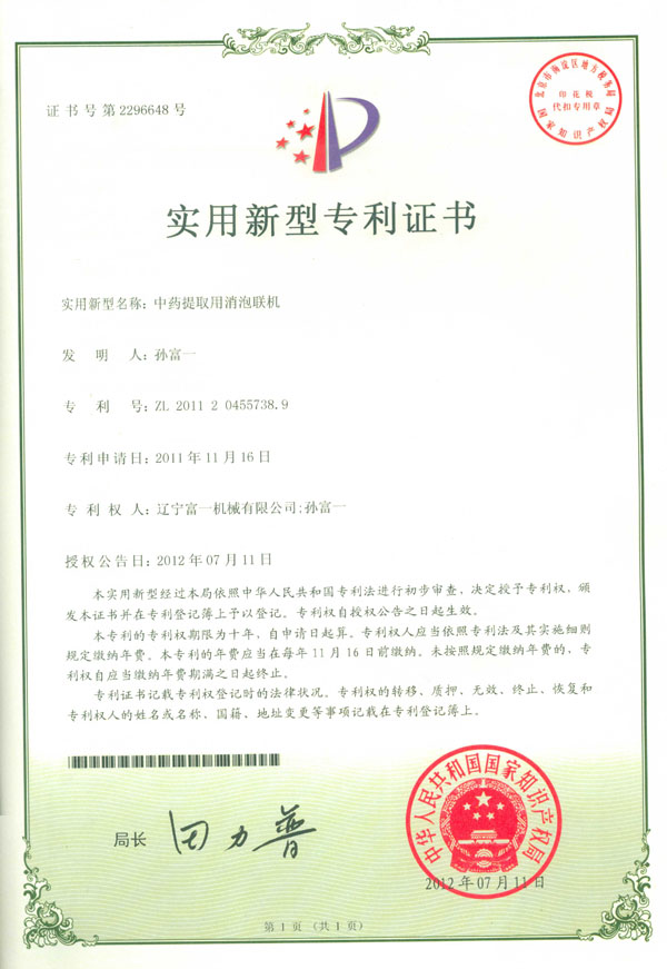中藥提取用消泡聯(lián)機專利證書